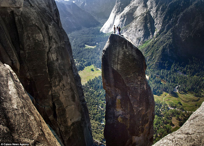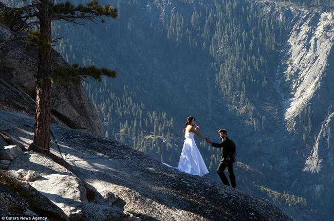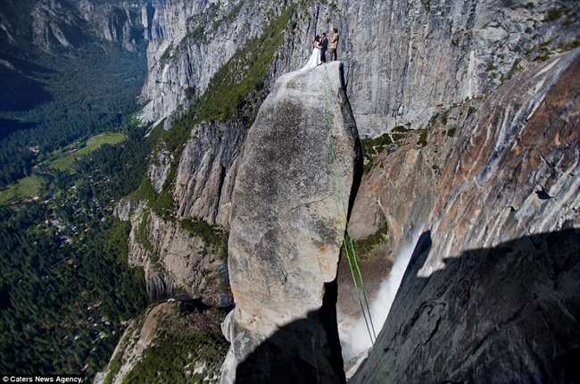 योसमिते राष्ट्रिय निकुञ्जको भिमकाय र डलरलाग्दो चट्टानमा एक जोडी पुगेर अंगालो मारे, चुम्बन गरे र बिबाह गरे । सेतो गाउनमा सजिएकी बेहुली र कालो सुटमा सजिएका बेहुला ३ हजार फिटमाथि टाँगिएको डोरीमा झुण्डिदै बिबाहका लागि तय गरिएको विशाल चट्टानमाथि पुगे । त्यहाँ उनीहरुले बिभिन्न पोज दिए, जसलाई कैद गर्न फेाटोग्राफर बेन हटन तयार थिए ।