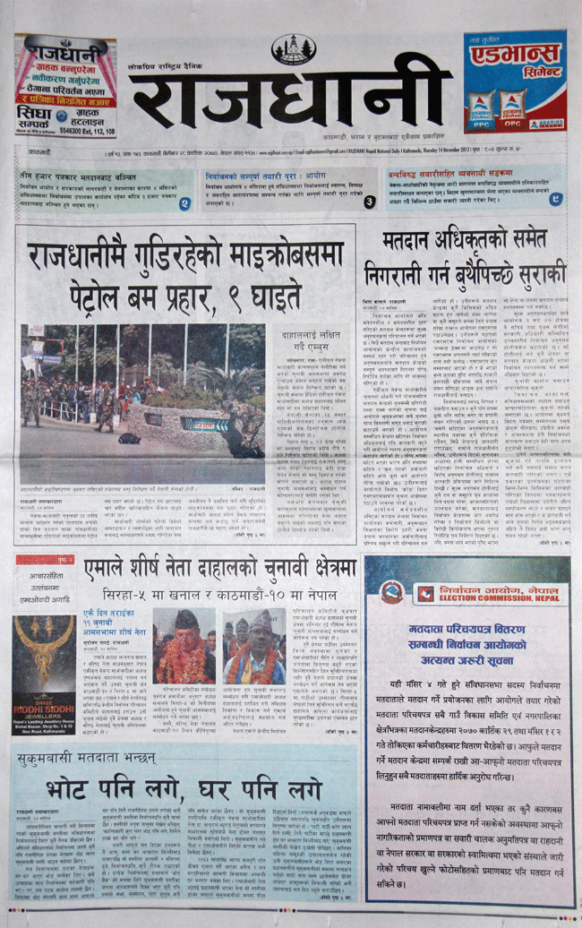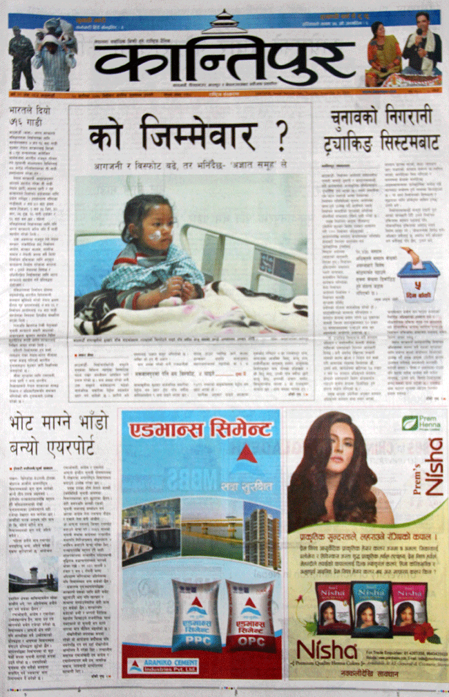 आज मिति २०७० कात्तिक २८ गते बिहीबार । राजधानीबाट प्रकाशित आजका दैनिक पत्रिकाले यात्रु सवार माइक्रोबसमा बम प्रहार भएको, बालबालिकासहित ८ जना घाइते भएको र बम आतंकले जनता त्रसित भएको खबरलाई प्राथमिकताका साथ छापेका छन् ।