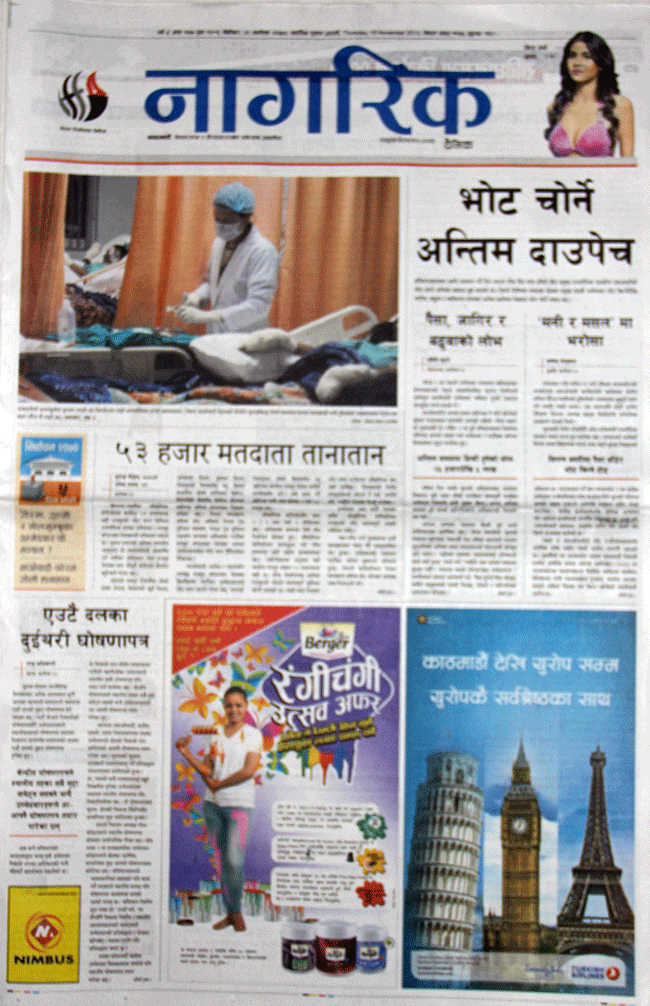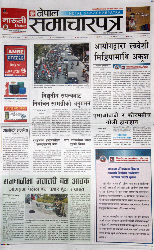 चुनावको निगरानी ट्याकिङ सिस्टमबाट हुने खबरलाई कान्तिपुरले मुख्य रुपमा छापेको छ भने भोट चोर्ने अन्तिम दाउपेच रहेको नागरिक दैनिकले मुख्य खबर छापेको छ ।